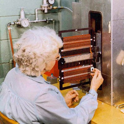 La titánica tarea de enhebrar los cables en los núcleos de ferrita, respetando los ceros y unos del código binario impreso en miles de hojas de papel, fue realizada por mujeres que generalmente se reclutaban de las fábricas textiles de Massachusetts, debido a su habilidad y vista entrenada para el “bordado”. En bastidores especiales se disponían las placas memoria de anillos, y de acuerdo al diseño de ceros y unos que correspondía a esta placa, se enhebraban por fuera o por dentro del anillo el cable correspondiente. Estas trabajadoras recibieron, por parte de todos los integrantes del programa Apollo, el nombre, entre cariñoso y peyorativo, de LOL (Little Old Ladies, viejitas).