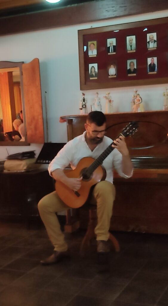 Y la tarde iba a llegando a su fin. Como broche de oro del espectáculo, el artista Sergio Pérez Neme nos deleitó con la interpretación de «Variaciones de milonga» de Eduardo Falú, «Metalúrgico» de Luis Gerardo Lagos y «La Galponera» de Osiris Rodríguez Castillo. Sergio llevó una guitarra histórica para amenizar el evento. Construida por Juan Carlos Santurión, este instrumento perteneció al poeta, cantor y payador Luis Gerardo Lagos, referente de nuestra música popular. Según el intérprete, esta guitarra estuvo quince años dormida, desde el fallecimiento de Lagos, y después de un cambio de cuerdas a cargo del artista, la histórica guitarra volvió a sonar en el Hogar de Ancianos. Son muchas emociones para una sola tarde, que perdurará en nuestro recuerdo para siempre.
