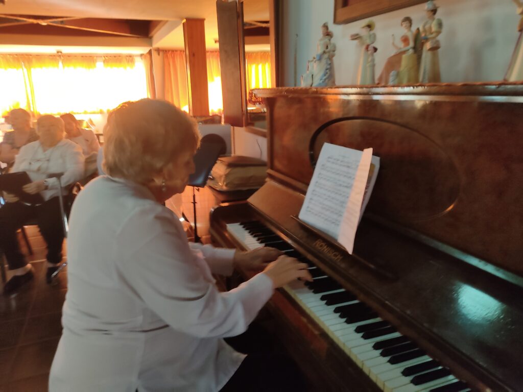 Pero la tarde nos seguía dando sorpresas. Haciendo eco a la máxima que dice: no hay edad para cumplir tus sueños, la residente del hogar Ethel Aguiar Romero, conocida como Titina, con sus jóvenes 89 años, ejecutó dos temas al piano: el vals «El Aeroplano», a solicitud de Winston, y el tango «A media luz». Los dedos de la pianista bailaban sobre el teclado, extrayendo del viejo piano vertical las notas exactas para volver a emocionarnos con la música.